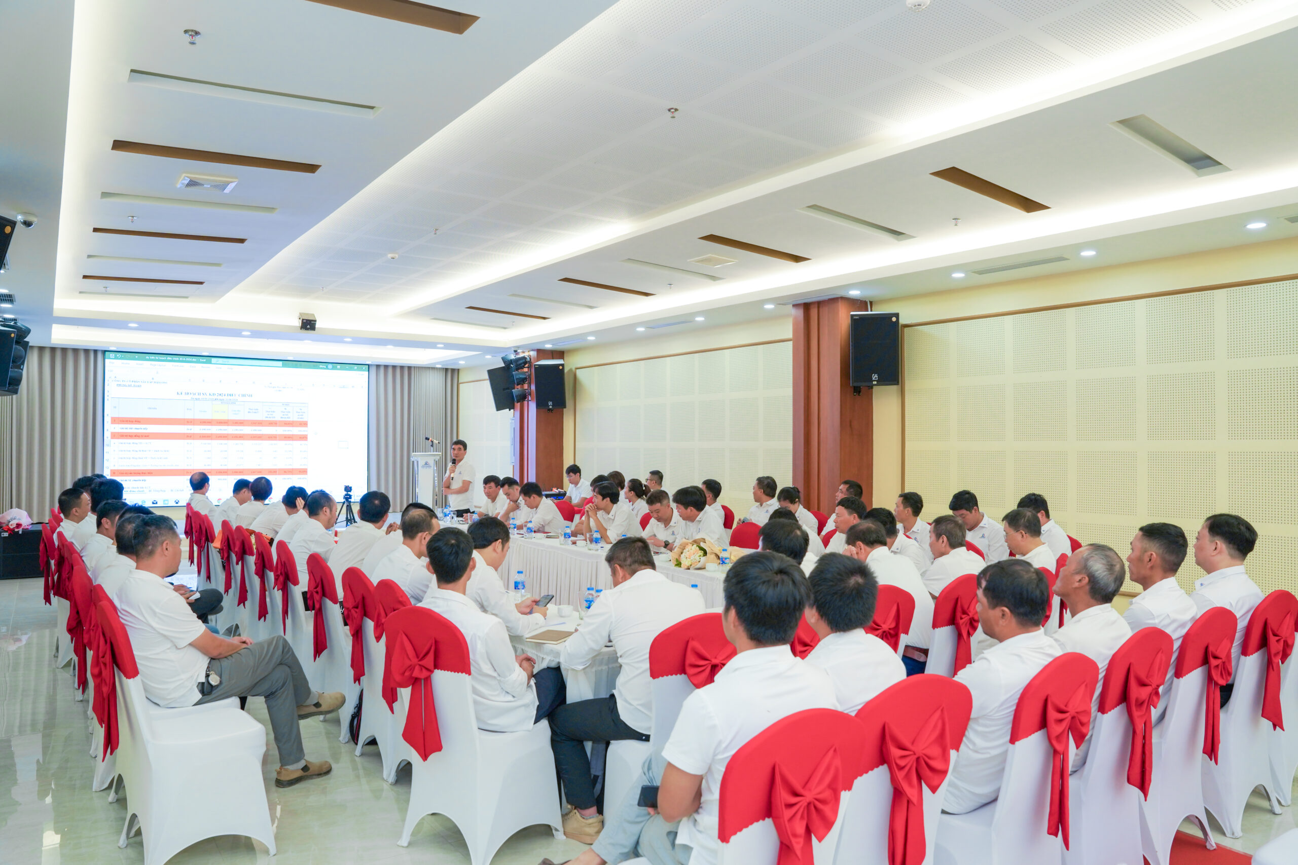 Mở đầu Hội nghị là nội dung công bố một số quyết định nhằm tiếp tục kiện toàn cơ cấu và bộ máy tổ chức, nhằm nâng cao hiệu lực hiệu quả quản lý và điều hành. Tiếp theo chương trình, Ông Phạm Tiến Dũng thay mặt ban Tổng giám đốc thông báo tới Hội nghị kết quả cuộc họp điều chỉnh kế hoạch năm 2024 đã được HĐQT công ty và tập đoàn chấp thuận, như sau : Chỉ tiêu Tổng giá trị Hợp đồng cả năm 2024 điều chỉnh giảm từ 4.350 tỷ kế hoạch xuống còn 3.680 tỷ, giá trị sản lượng điều chỉnh giảm từ 3.600 tỷ xuống còn 3.100 tỷ, giá trị doanh thu điều chỉnh giảm từ 3.000 tỷ xuống còn 2.660 tỷ, Thu hồi vốn điều chỉnh giảm từ 3.000 tỷ xuống còn 2.750 tỷ, sản xuất kết cấu thép điều chỉnh giảm từ 32.000 tấn xuống còn 30.000 tấn…, các chỉ tiêu khác giữ nguyên theo kế hoạch đầu năm.
